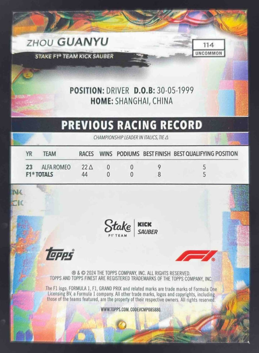 2024 Topps Finest Formula 1 Red/Black Vapor Refractors Zhou Guanyu Uncommon /15