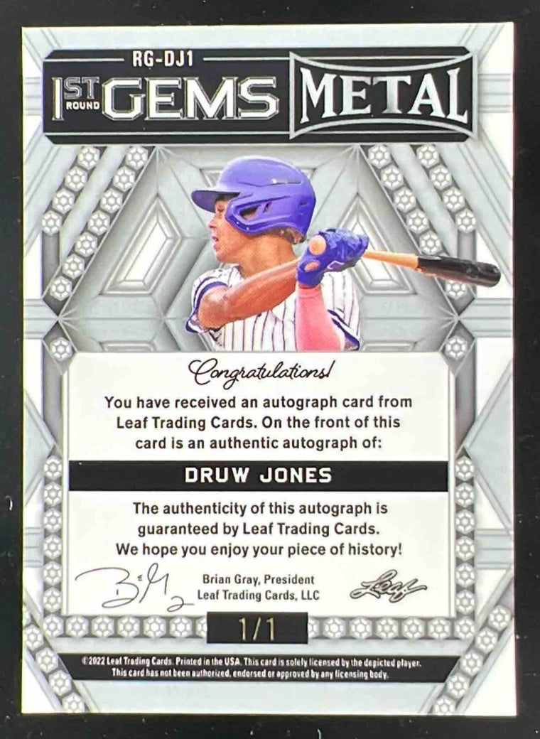 2022 Leaf Metal Round Gems Autographs Zebra Crystal #RG-DJ1 Druw Jones Auto 1/1