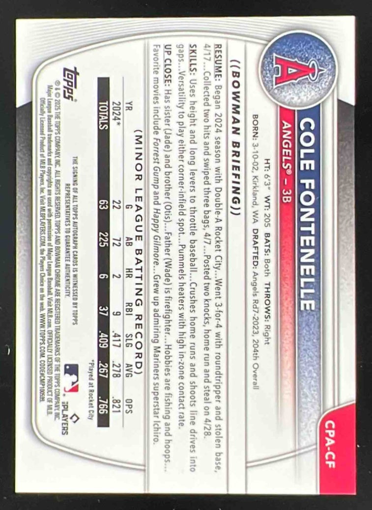 2025 Bowman Chrome Gold Shimmer Refractor #CPA-CF Cole Fontenelle RC Auto /50