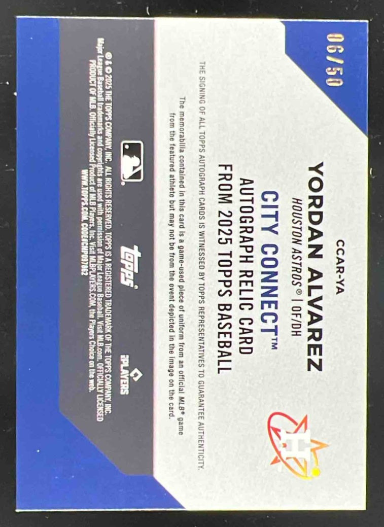 2025 Topps City Connect Swatch Relics Gold #CCAR-YA Yordan Alvarez Auto /50