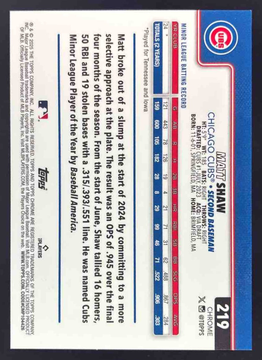 2025 Topps Chrome Gold Refractor #219 Matt Shaw RC /50