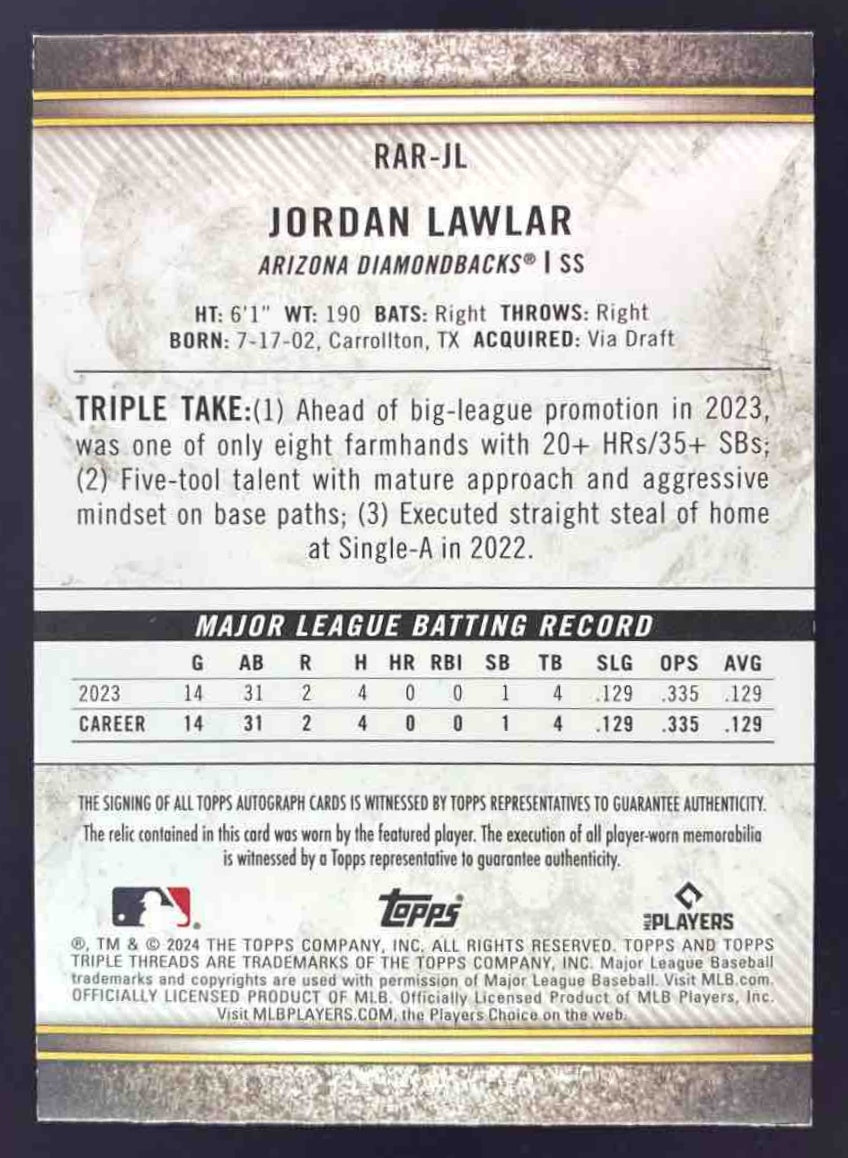 2024 Topps Triple Threads Rookie Relics #RAR-JL Jordan Lawlar RC Auto /99