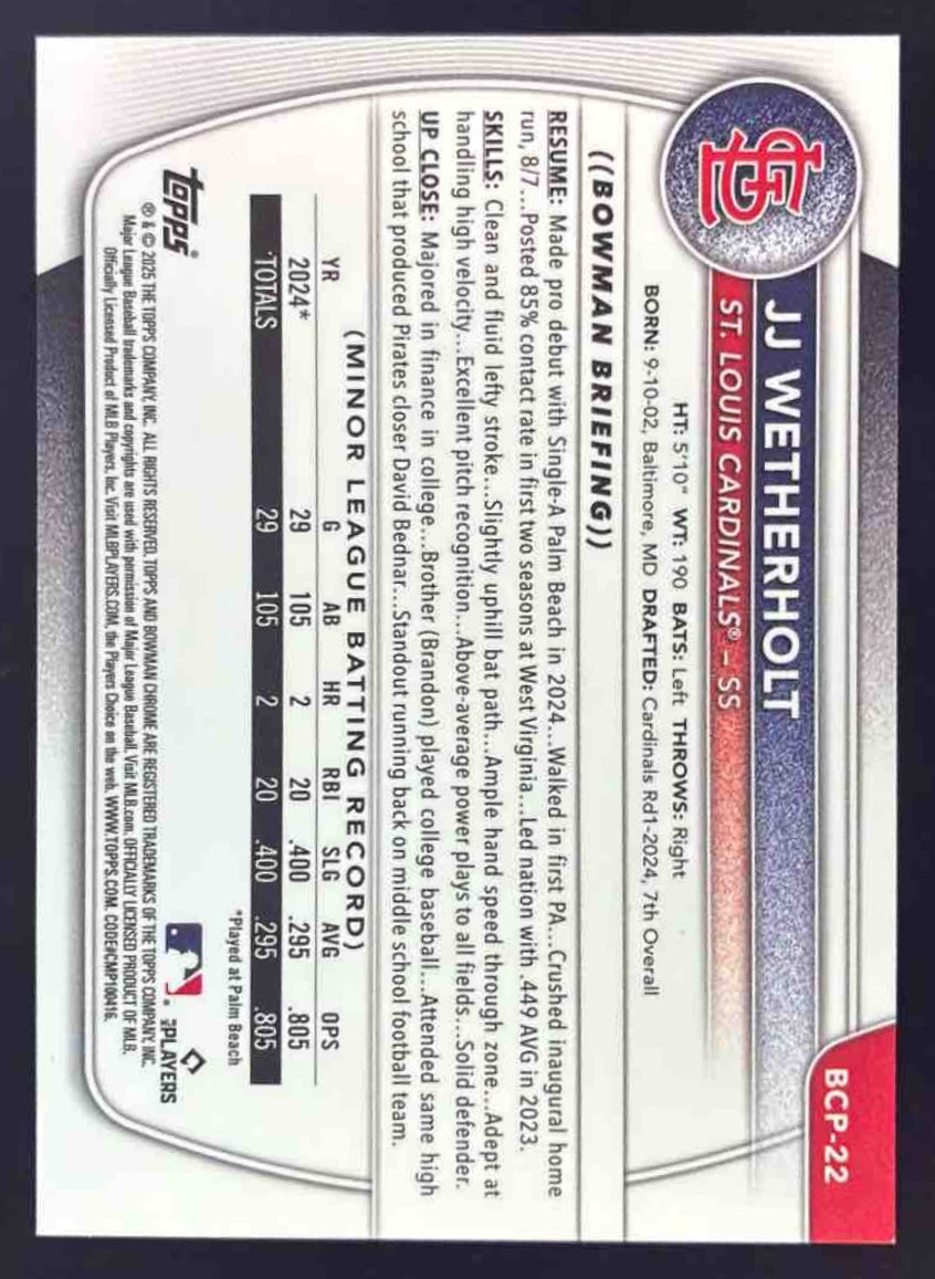 2025 Bowman Sapphire Chrome Prospects Yellow #BCP-22 JJ Wetherholt RC /75