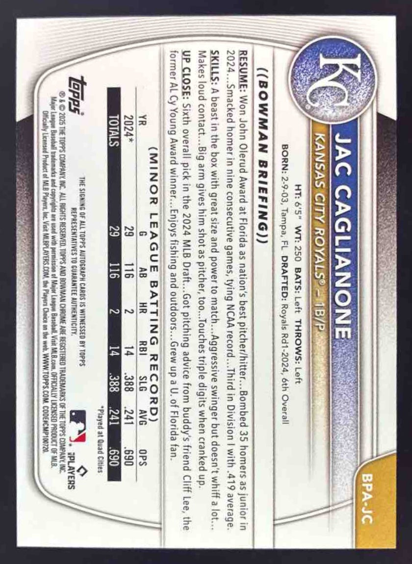 2025 Bowman Prospect Autographs #BPA-JC Jac Caglianone Auto