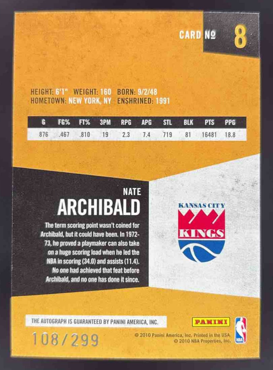 2010-11 Panini Hall of Fame Monikers #8 Nate Archibald Auto /299