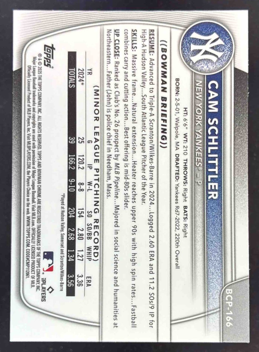2025 Bowman Chrome Chrome Prospects #BCP-166 Cam Schlittler RC