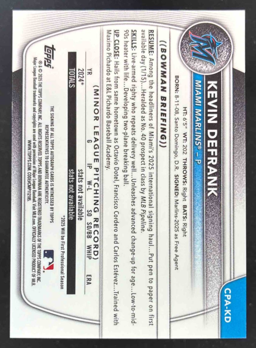 2025 Bowman Chrome Autograph Reptilian Green #CPA-KD Kevin Defrank RC Auto /99