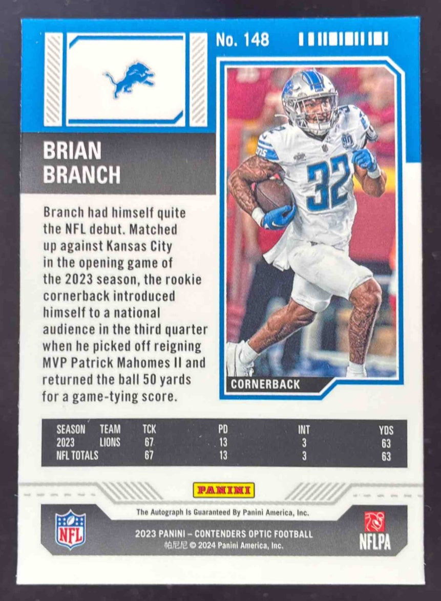 2023 Contenders Optic #148 Brian Branch Autograph RC Rookie Ticket Auto Auto