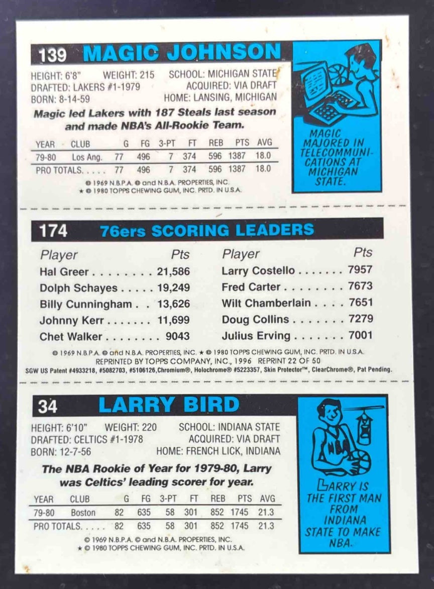 1996-97 Topps Finest Reprints #22 Larry Bird Julius Erving Magic Johnson