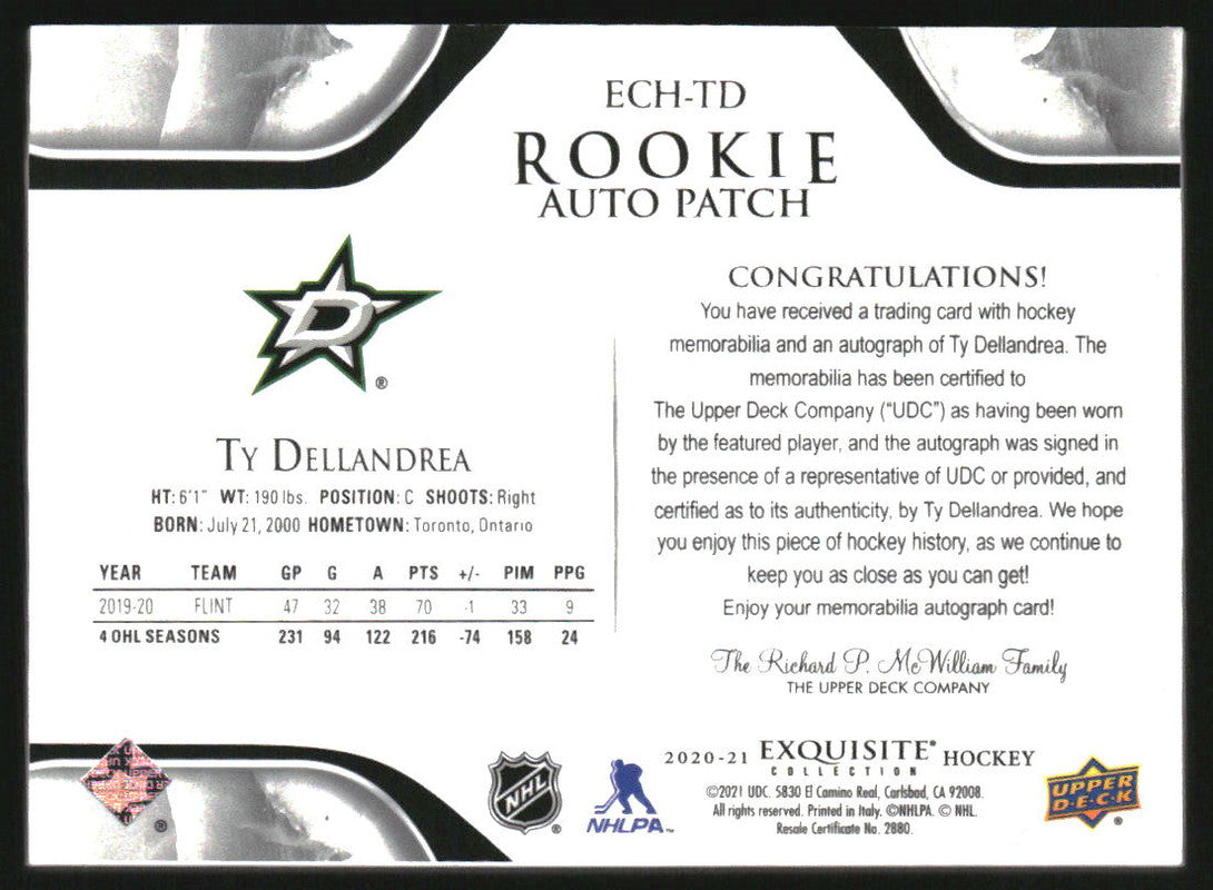 2020-21 Exquisite Collection Rookie Patch Auto Horizontal Ty Dellandrea RC /25
