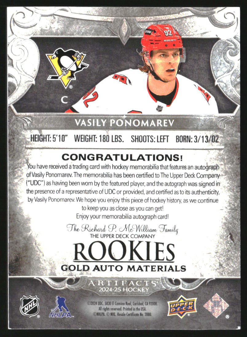 2024-25 Artifacts Material Autographs Gold #184 Vasily Ponomarev RC Auto /199