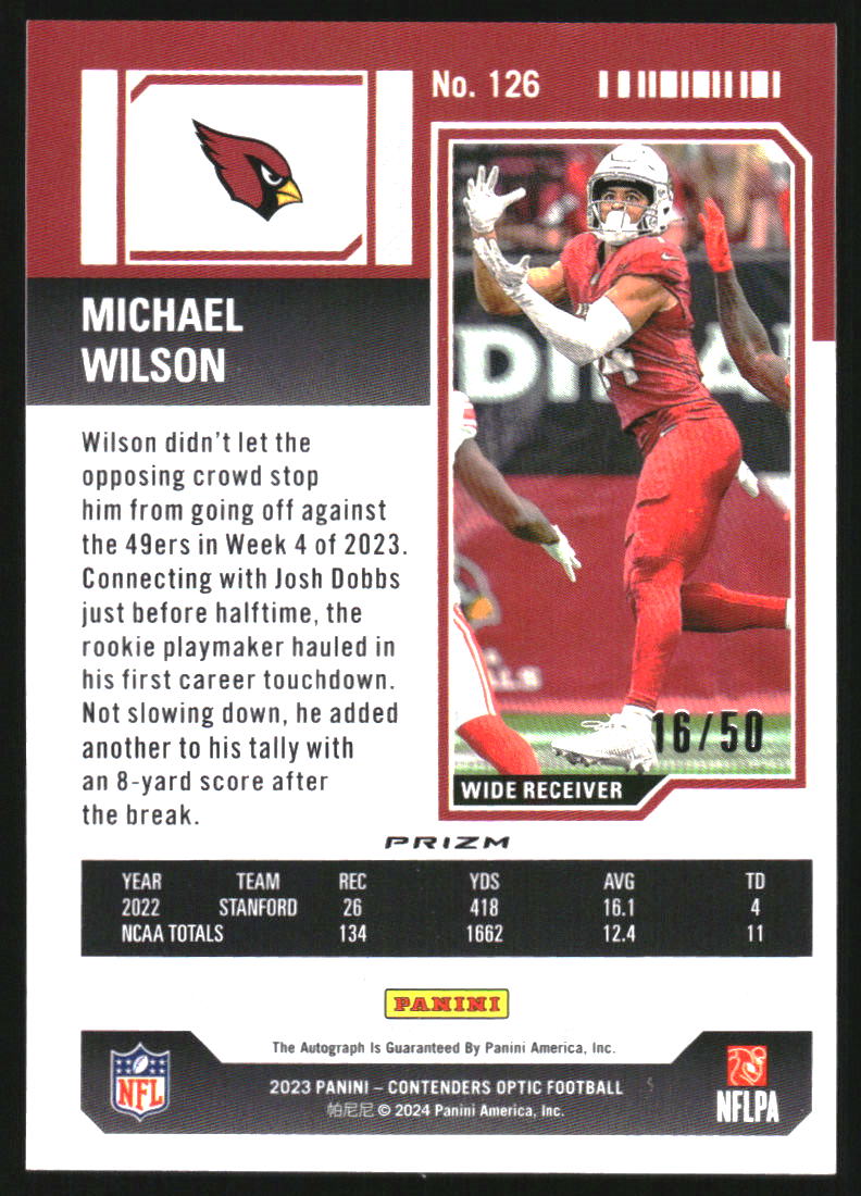 2023 Contenders Optic Orange #126 Michael Wilson Rookie Autograph RC Auto /50