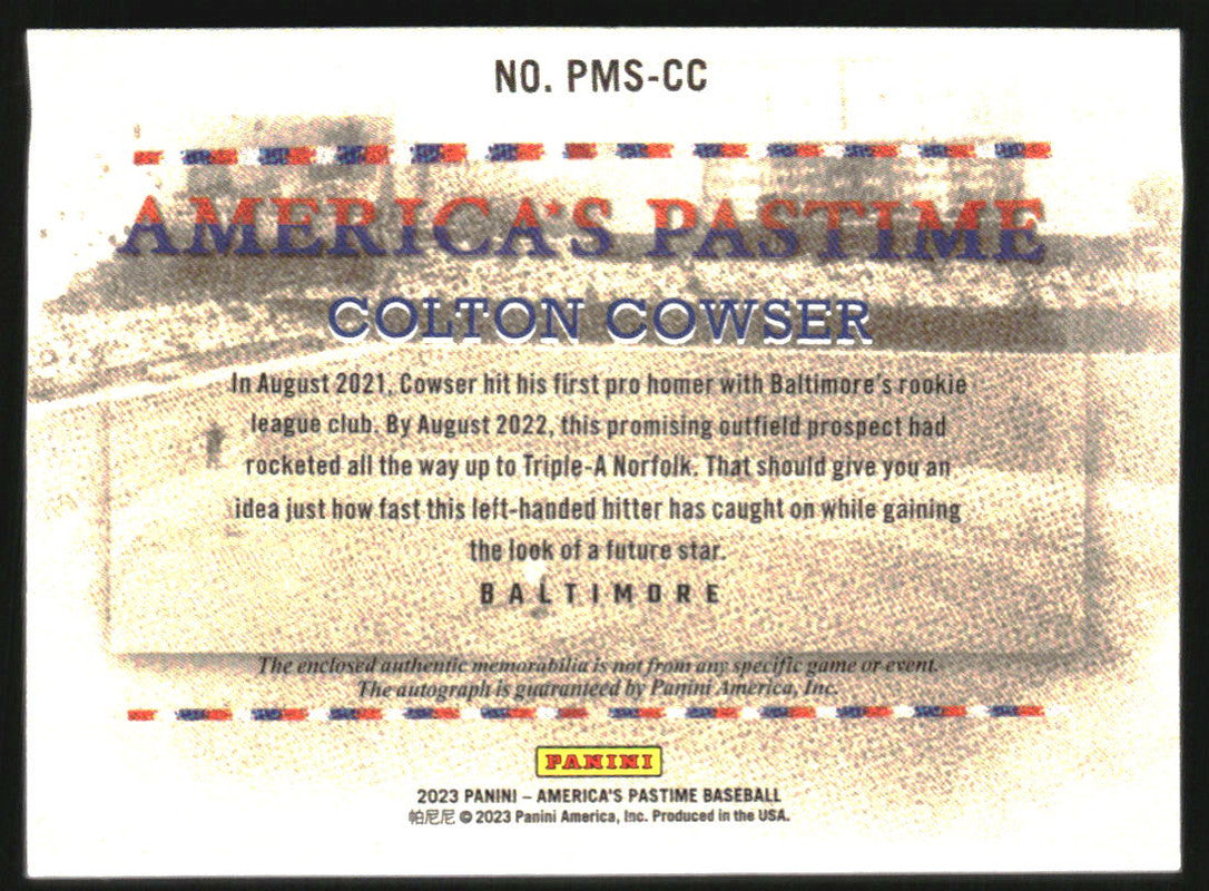 2023 Panini Chronicles Americas Pastime Pastime Material Auto Colton Cowser /100