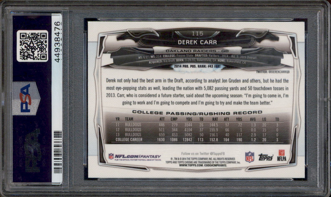 2014 Topps Chrome With Ball #115 Derek Carr RC Rookie PSA 10
