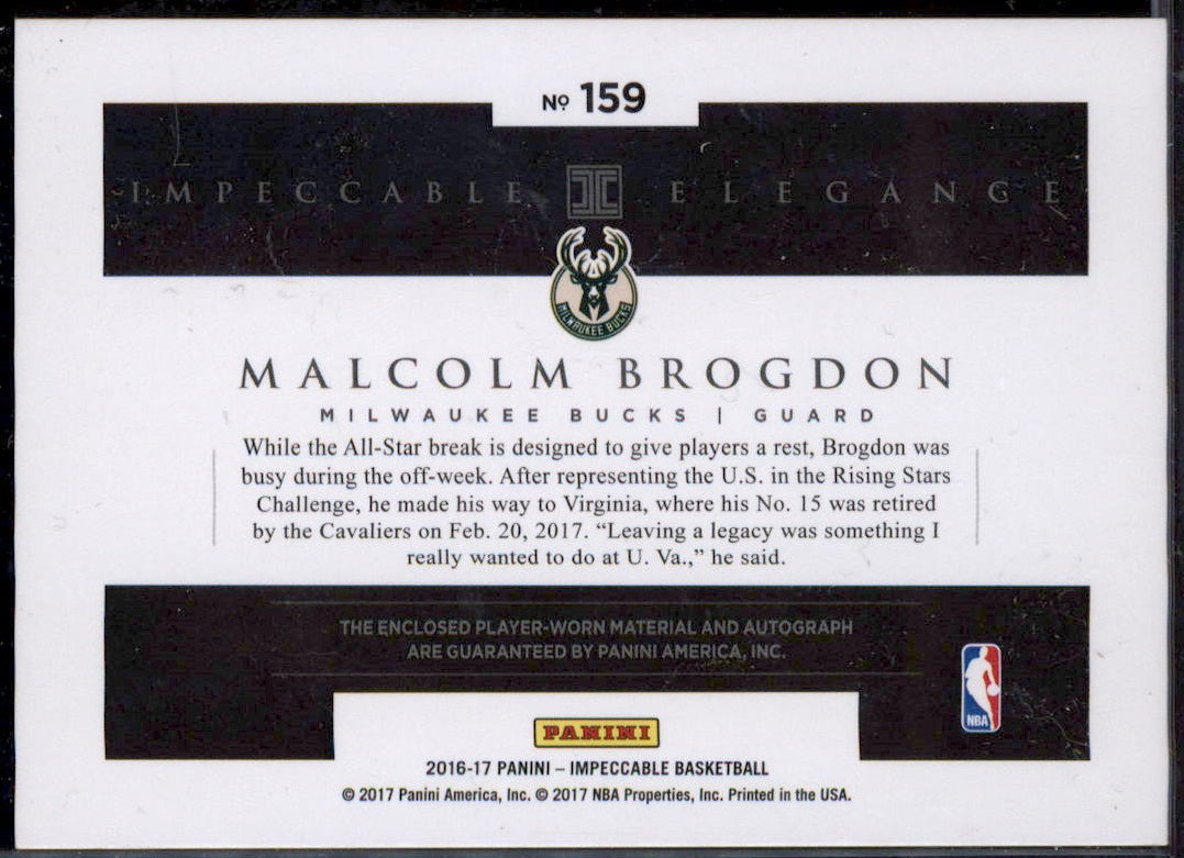 2016-17 Panini Impeccable Silver #159 Malcolm Brogdon RC Jersey Auto /49