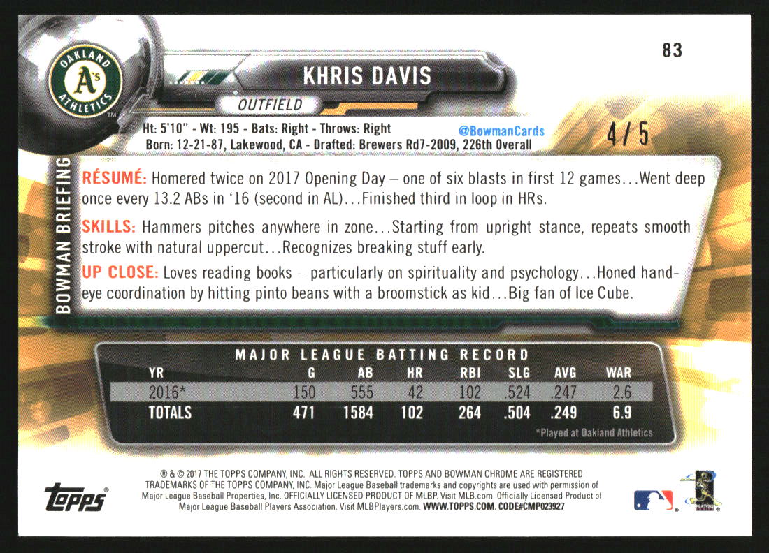 2017 Bowman Chrome Red Refractor #83 Khris Davis /5