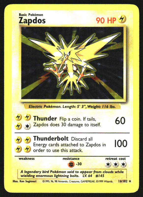 1999 Pokemon Set Unlimited #16 Zapdos Rare Holo