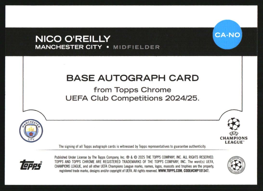 2024-25 Topps Chrome UEFA Autographs Green Refractor Nico O'Reilly RC Auto /99