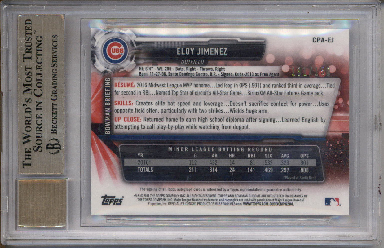 2017 Bowman Chrome Prospect Auto Blue Refractors Eloy Jimenez /150 BGS 10
