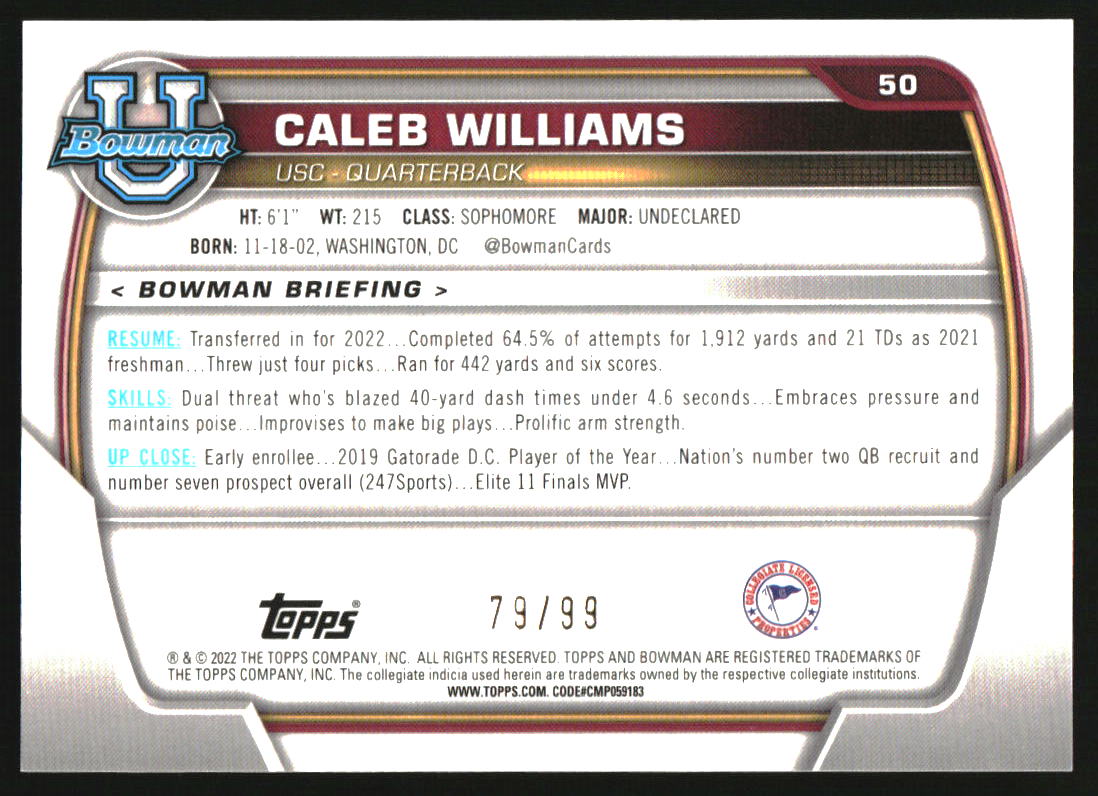 2022 Bowman University Chrome Green Refractor #50 Caleb Williams /99