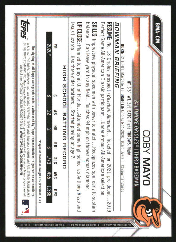 2021 Bowman Chrome Autographs Mega Box Mojo Refractor #BMA-CM Coby Mayo Auto