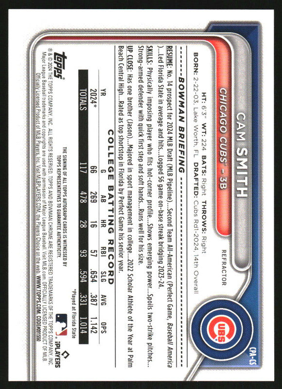 2024 Bowman Draft Chrome Autographs Refractor #CPA-CS Cam Smith RC Auto /499