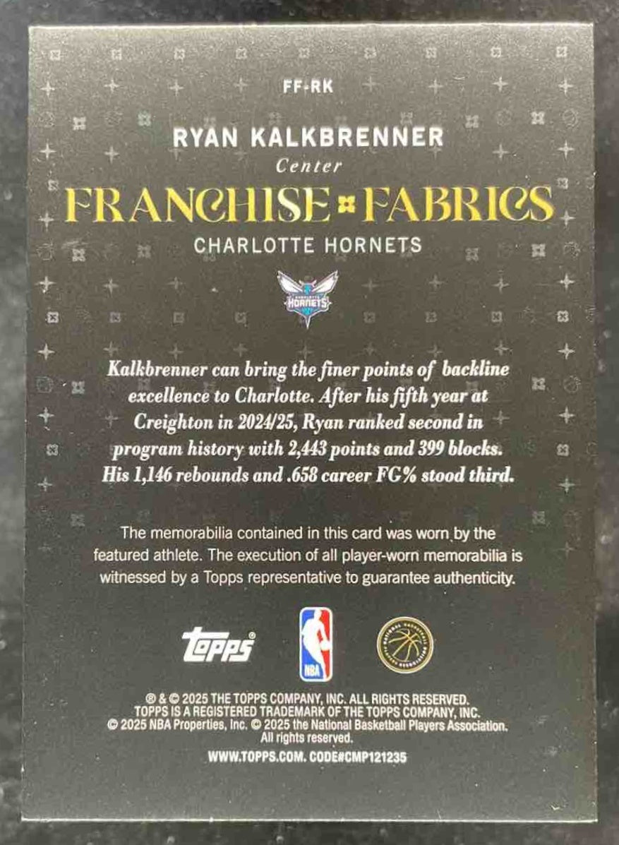 2025-26 Topps Franchise Fabrics Orange Holo Foil #FF-RK Ryan Kalkbrenner RC /25