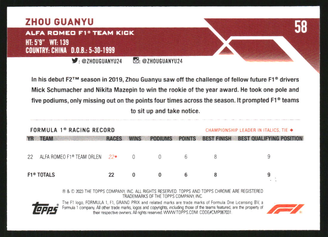 2023 Topps Chrome Sapphire Formula 1 Aqua Refractors #58 Zhou Guanyu /99