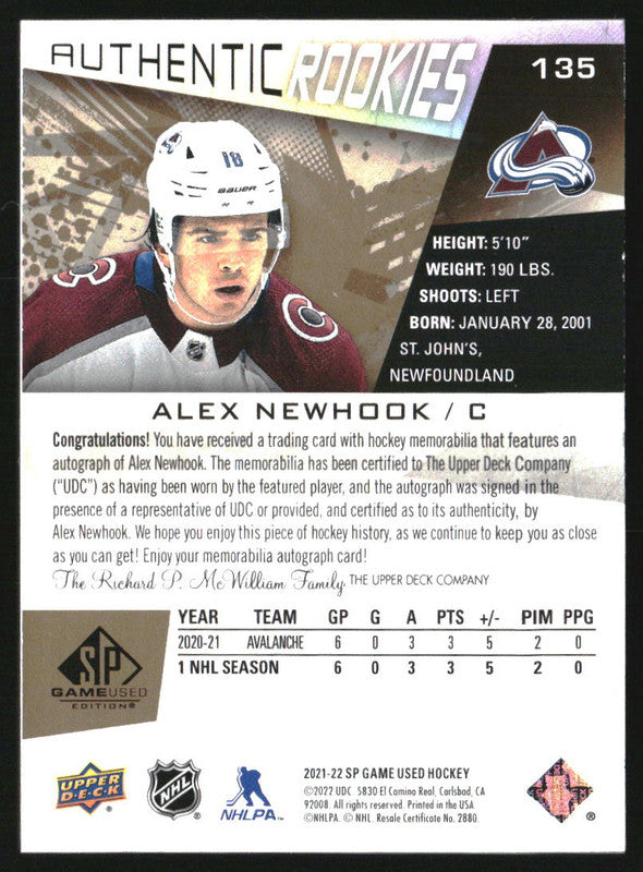 2021-22 SP Game Used Gold Jersey Autographs #135 Alex Newhook RC Auto /99