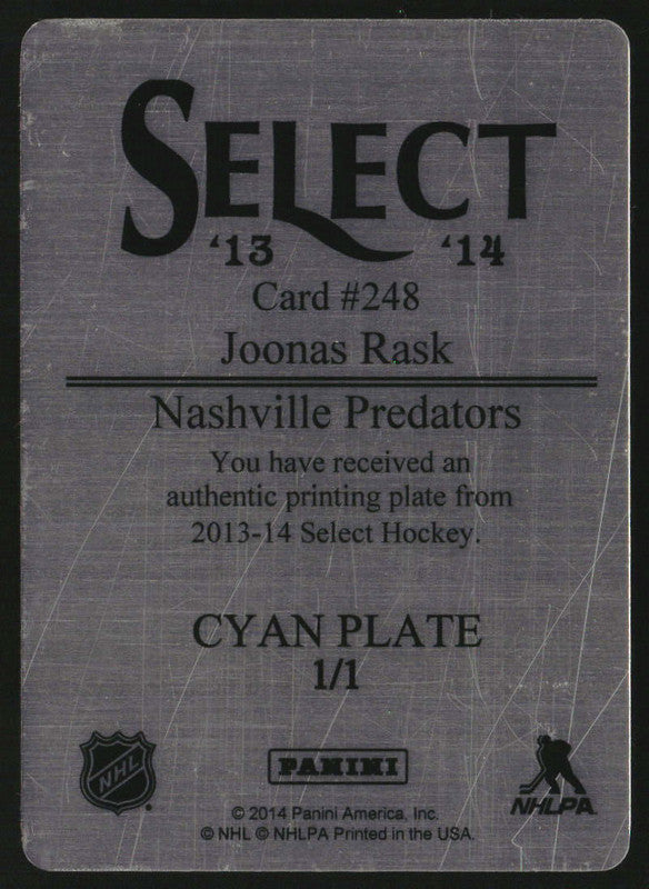 2013-14 Select Printing Plate Cyan #248 Joonas Rask RC Rookie 1/1