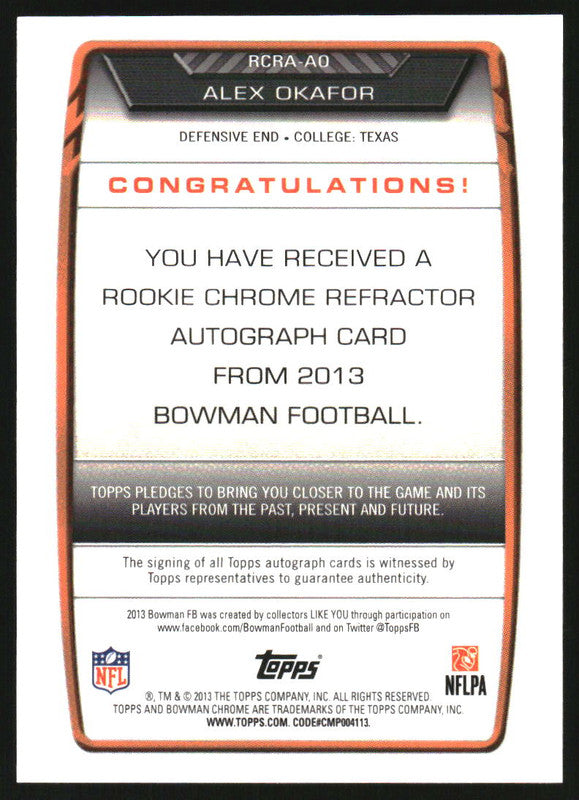 2013 Bowman Chrome Rookie Autographs Xfractors Alex Okafor RC Auto /10