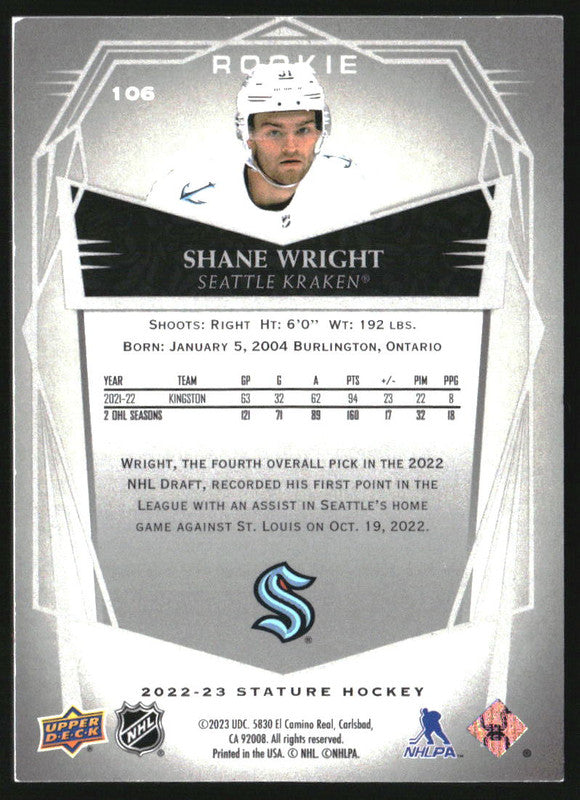 2022-23 Upper Deck Stature Design Photo Variant #106 Shane Wright RC /22
