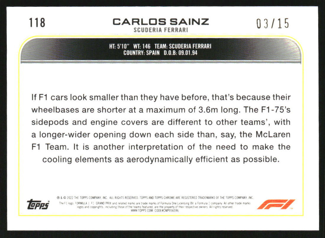 2022 Topps Chrome Sapphire Formula 1 Black and White Refractors Carlos Sainz /15