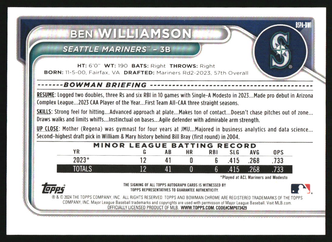 2024 Bowman Sapphire Chrome Autographs Gold Sapphire Ben Williamson RC Auto /50
