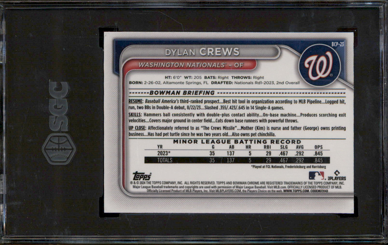 2024 Bowman Chrome Sapphire Yellow #BCP23 Dylan Crews RC /75 SGC 9