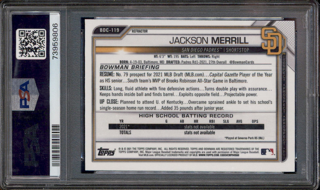 2021 Bowman Chrome Draft Refractor #BDC119 Jackson Merrill RC PSA 10
