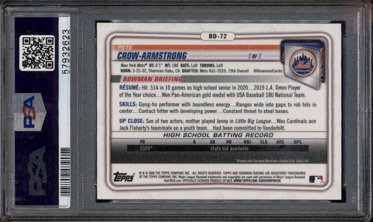 2020 Bowman Draft Chrome #BD72 Pete Crow-Armstrong RC PSA 10