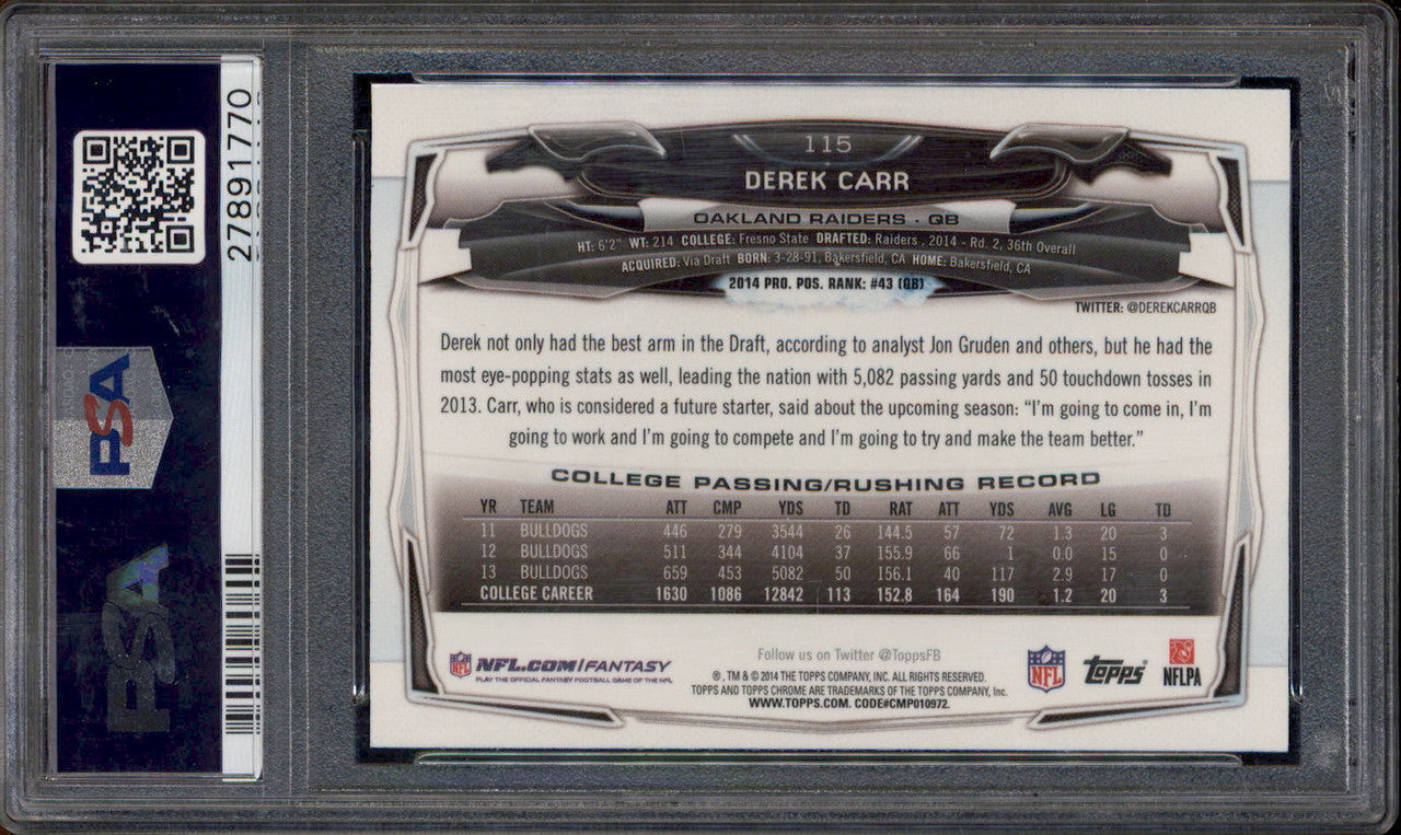 2014 Topps Chrome #115 Derek Carr With Ball RC Rookie PSA 10