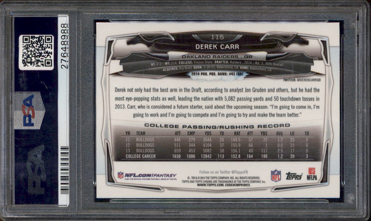 2014 Topps Chrome #115 Derek Carr With Ball RC Rookie PSA 10