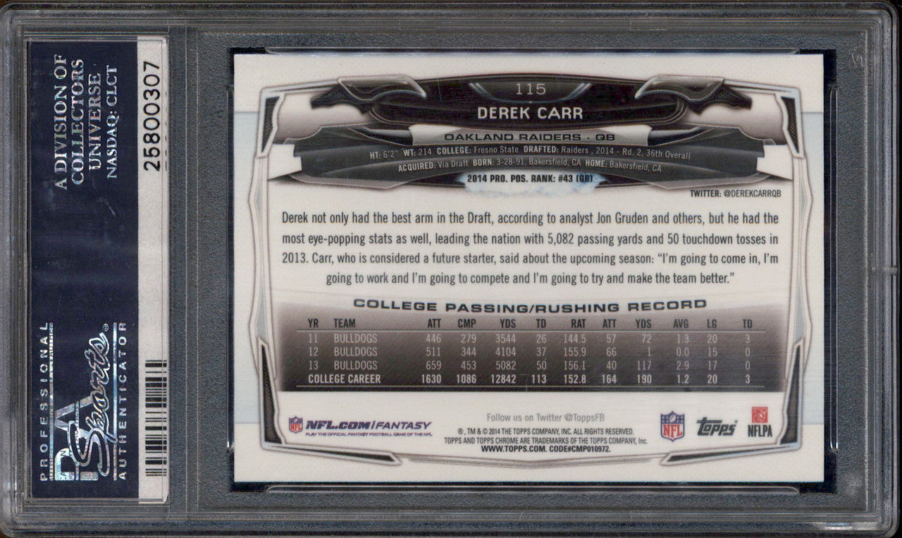 2014 Topps Chrome #115 Derek Carr With Ball RC Rookie PSA 10