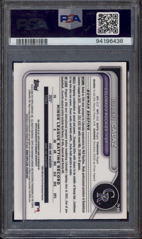 2024 Bowman Chrome Autograph Blue Refractor Robert Calaz RC Auto /150 PSA 9
