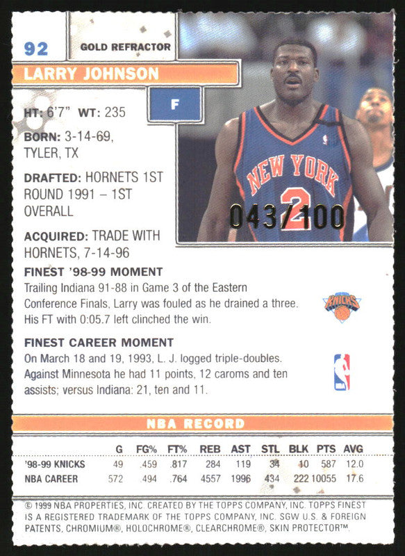 1999-00 Topps Finest Gold Refractors #92 Larry Johnson /100