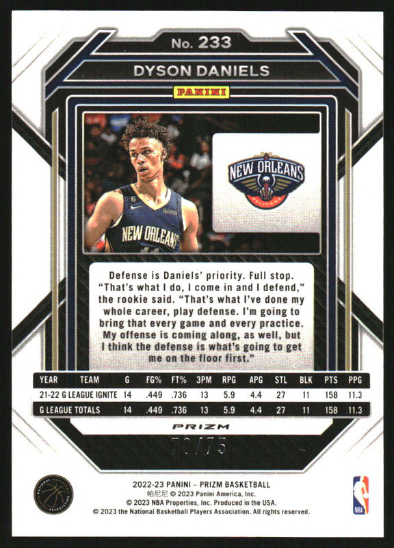 2022-23 Panini Prizm Prizms Fast Break Purple #233 Dyson Daniels RC /75