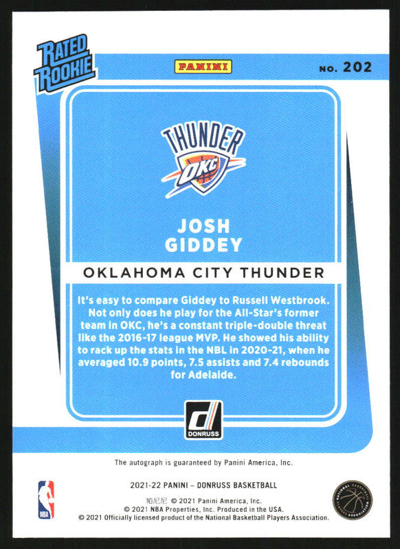2021 Donruss Rated Rookies Signatures Holo Green Ice #202 Josh Giddey RC Auto