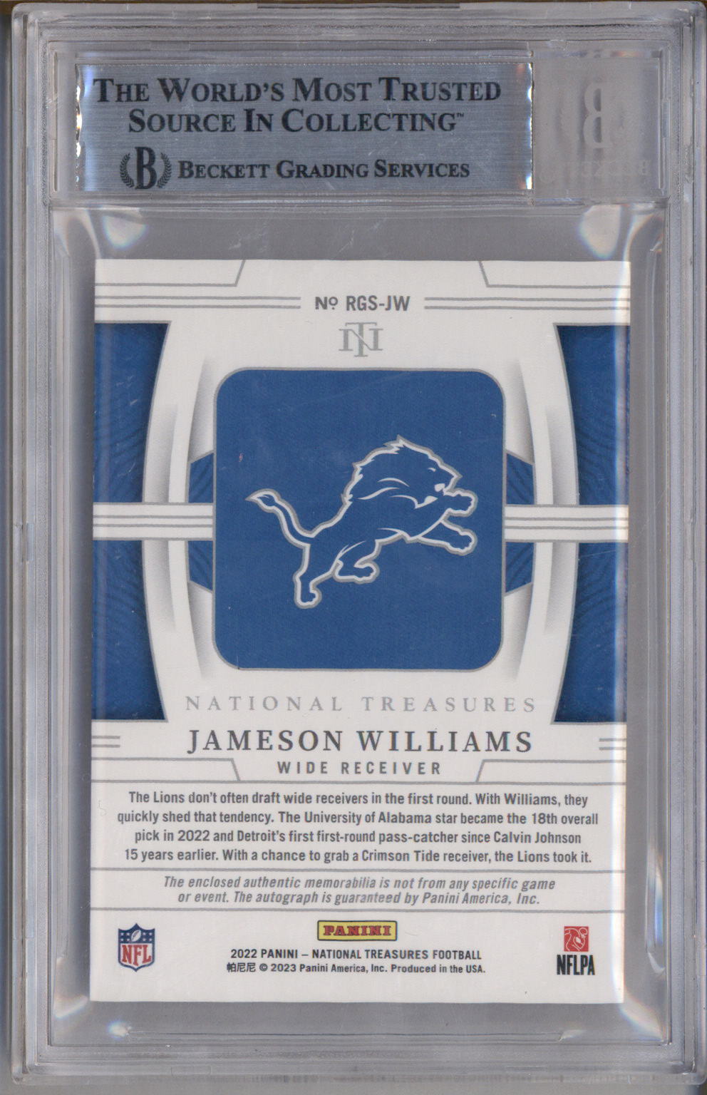 2022 National Treasures NFL Gear Laundry Tag Jameson Williams RC Auto 1/1 BGS 9