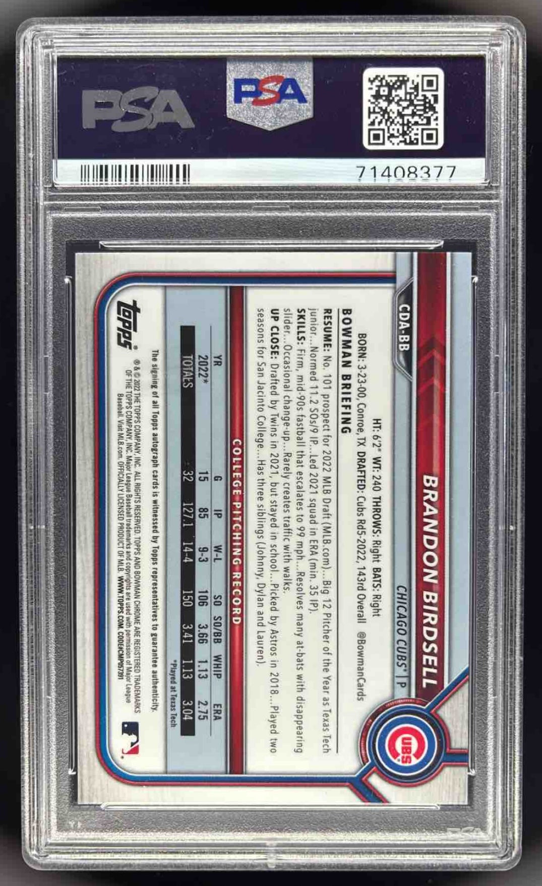 2022 Bowman Draft Chrome Aqua Lava #CDA-BB Brandon Birdsell RC Auto /199 PSA 10