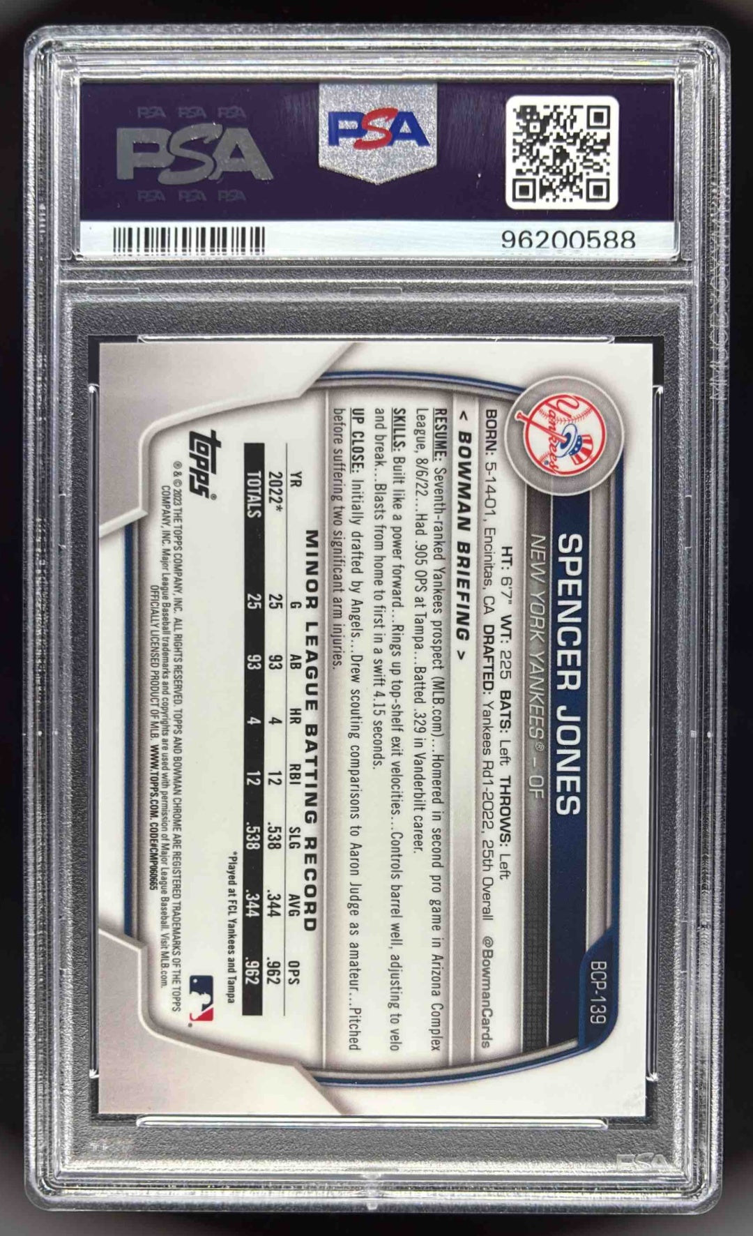 2023 Bowman Chrome Blue Shimmer Refractor Spencer Jones RC /150 PSA 10
