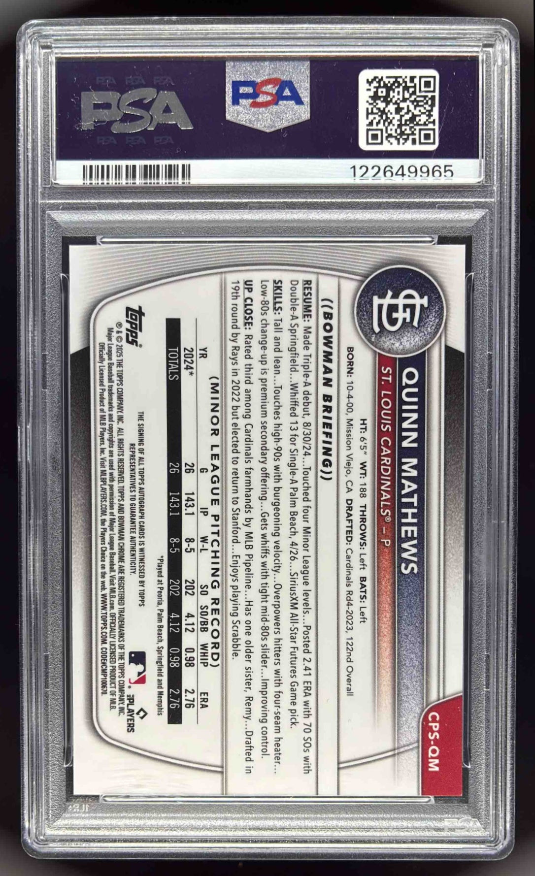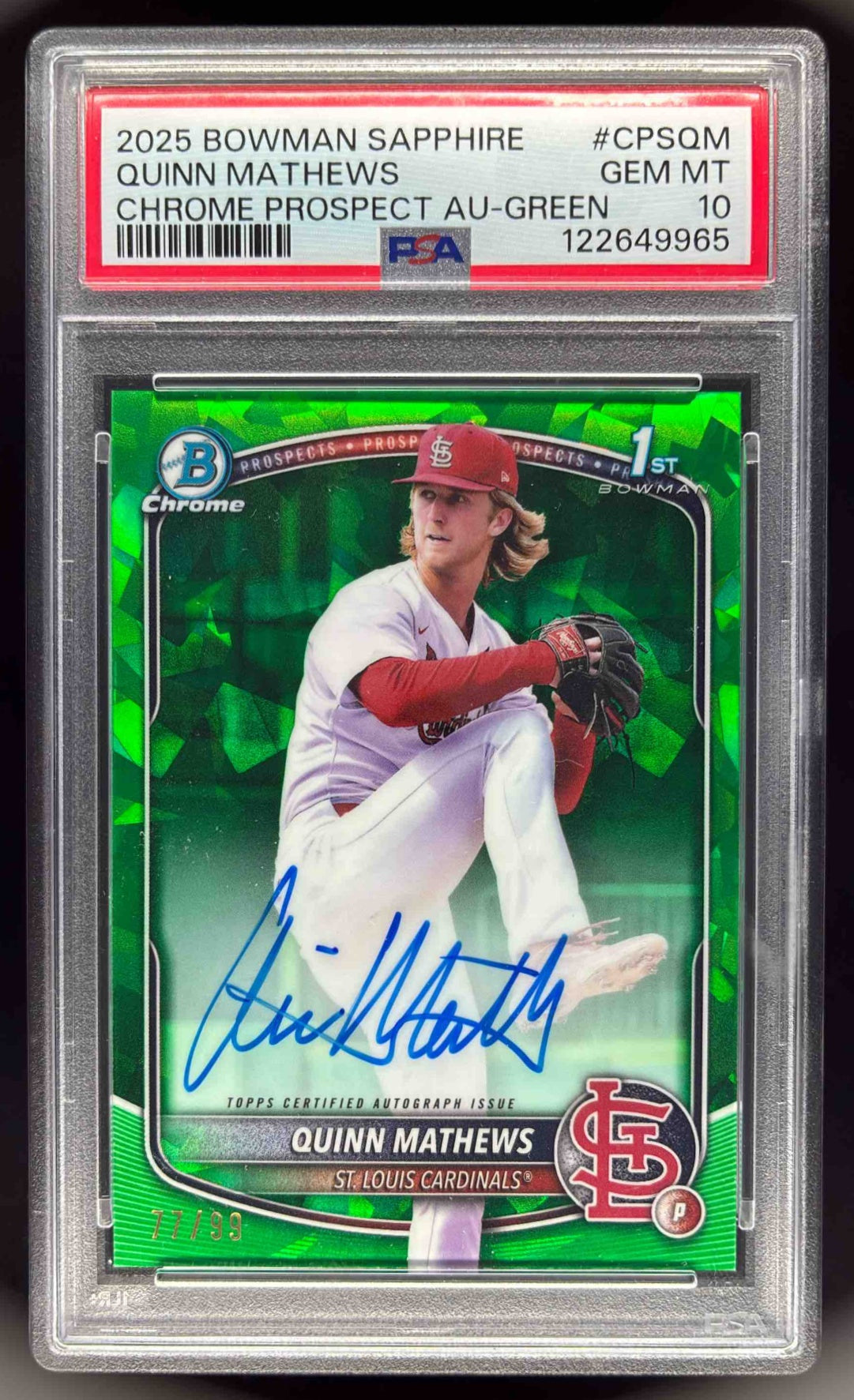 2025 Bowman Sapphire Chrome Green Refractors Quinn Mathews RC Auto /99 PSA 10