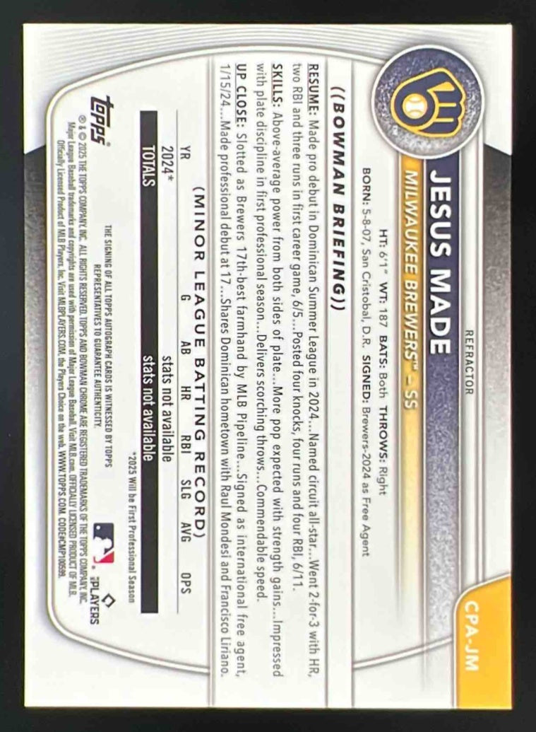 2025 Bowman Chrome Autographs Refractor #CPA-JM Jesus Made RC Auto /499