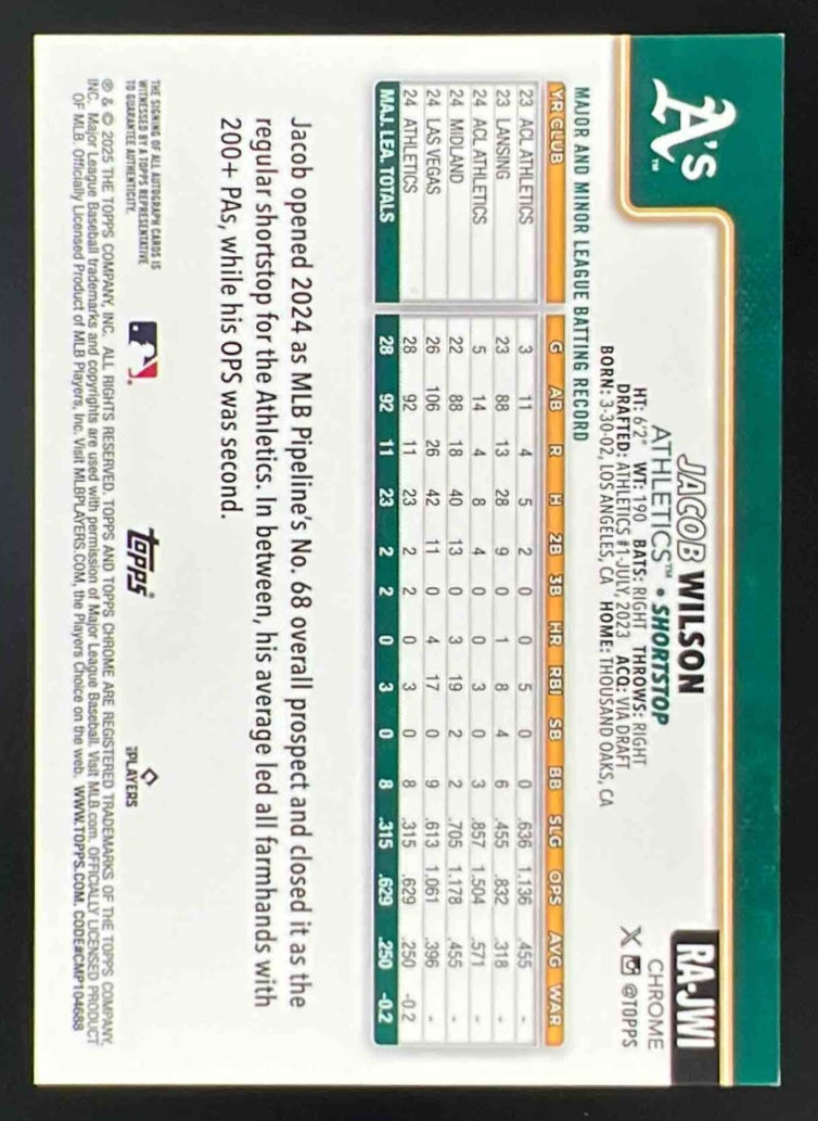2025 Topps Chrome Rookie Purple Speckle #RA-JWI Jacob Wilson RC Auto /299